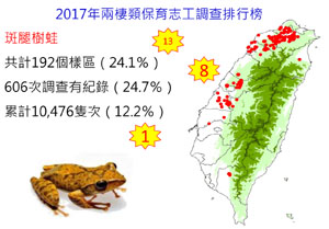 本年度有 61 個志工團隊參與調查,範圍涵蓋了 22 個縣市、 799 個樣區,上 傳 31,156 筆調查資料。自 2006 年開始至今,已累積 231,339 筆調查資料, 這些長期監測的大量資料,足夠做為評估台灣蛙類變化趨勢基礎。今年分布以澤蛙和拉都希氏赤蛙較多。樣區最多出現 21 種蛙類,蛙種數高 (>15 種)的樣區共 有 41 個。